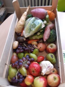 Dans sa caisse, il y avait: des oignons, de l’ail, un radis rose, un radis noir, des pommes de terre, des patates douces, du fenouil, des carottes, un navet doré, une courge, des champignons, des courgettes, des tomates, un brocoli, un chou-fleur et un panais.